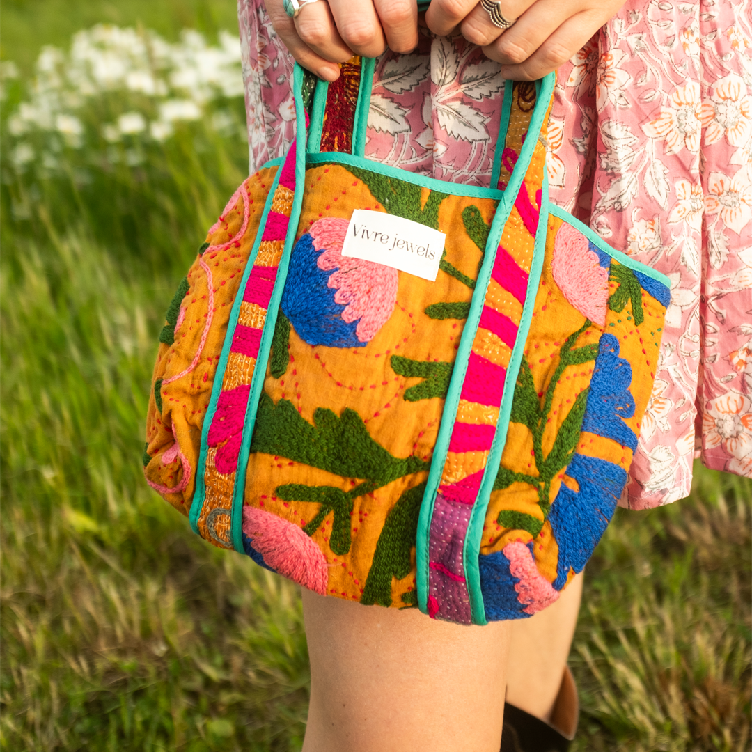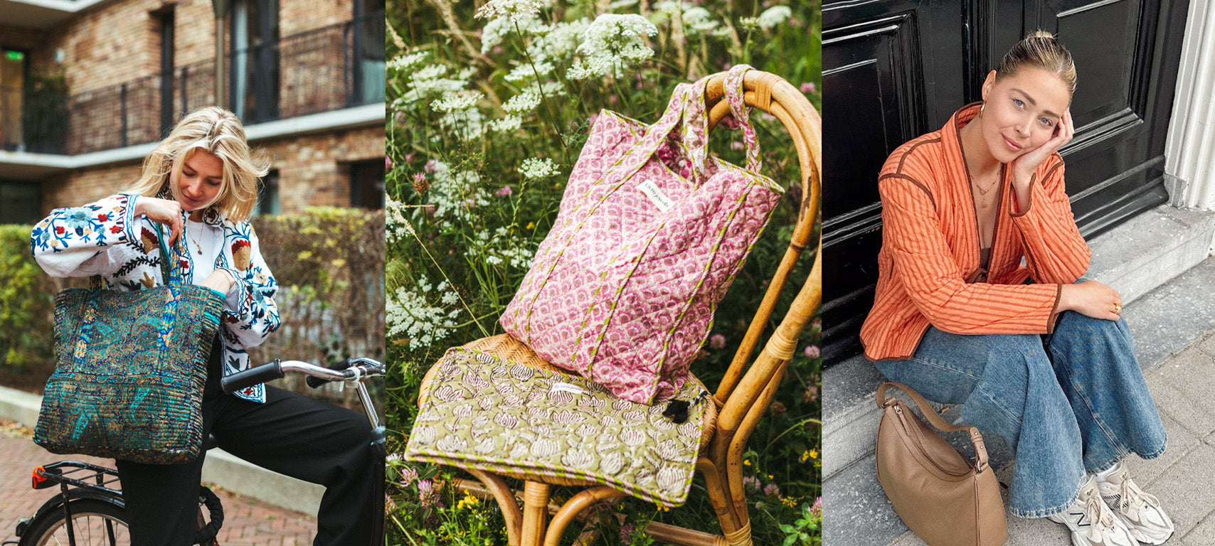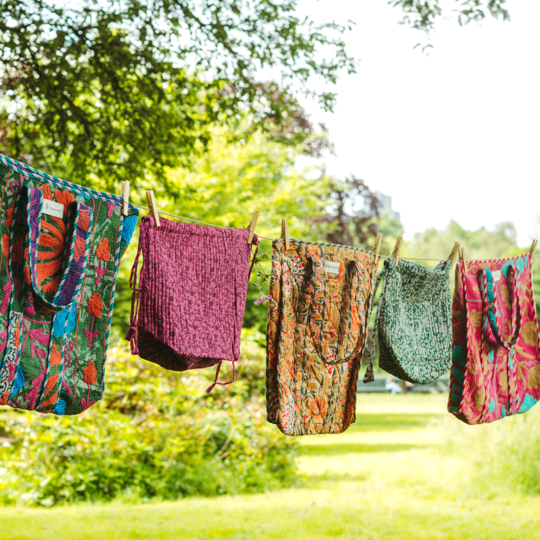 Our Indian craftsmen use various materials and techniques, such as the blockprint technique with wooden stamps for unique patterns on fabrics. The collection also includes reuse of silk saris and kantha vintage blankets, which are given new life as bags or kimonos. With these items you not only carry beautiful clothes, but also a piece of India with you.