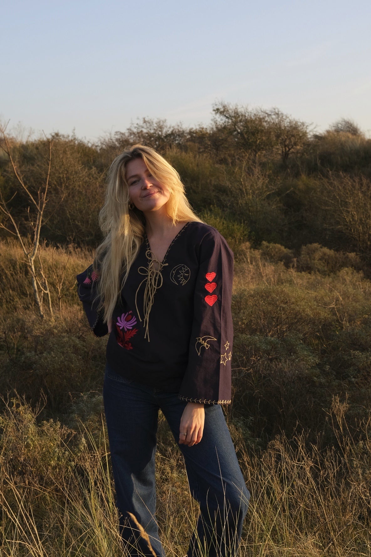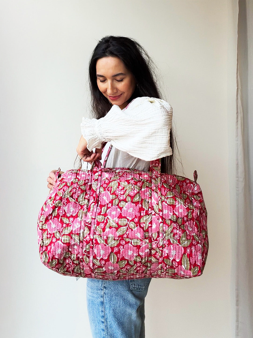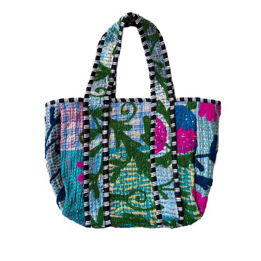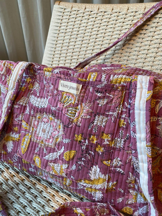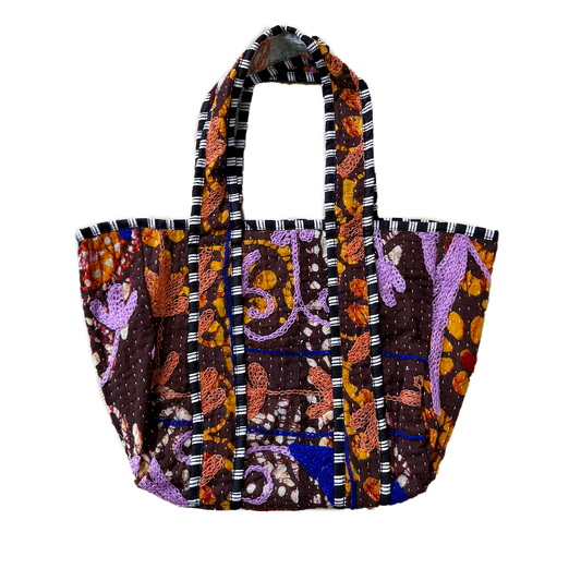 Our Indian craftsmen use various materials and techniques, such as the blockprint technique with wooden stamps for unique patterns on fabrics. The collection also includes reuse of silk saris and kantha vintage blankets, which are given new life as bags or kimonos. With these items you not only carry beautiful clothes, but also a piece of India with you.