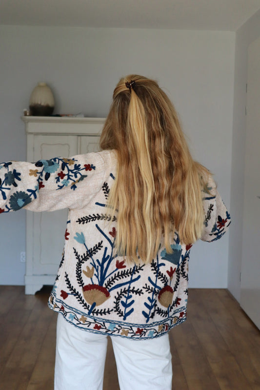 At Vivre Jewels we have a diverse collection of exclusive embroidered jackets for women with unique patterns, prints and beautiful colors. Each jacket is hand-embroidered with the utmost care in India by local artisans under fair conditions. Our embroidered jackets are airy, mid-length, with long sleeves, made of cotton and have an oversized fit. They can be perfectly combined with different items of clothing, such as a sweater, t-shirt or vest, making them suitable for styling in spring, summer, autumn and winter! Discover and order your favorite embroidered jacket online today at Vivre Jewels.