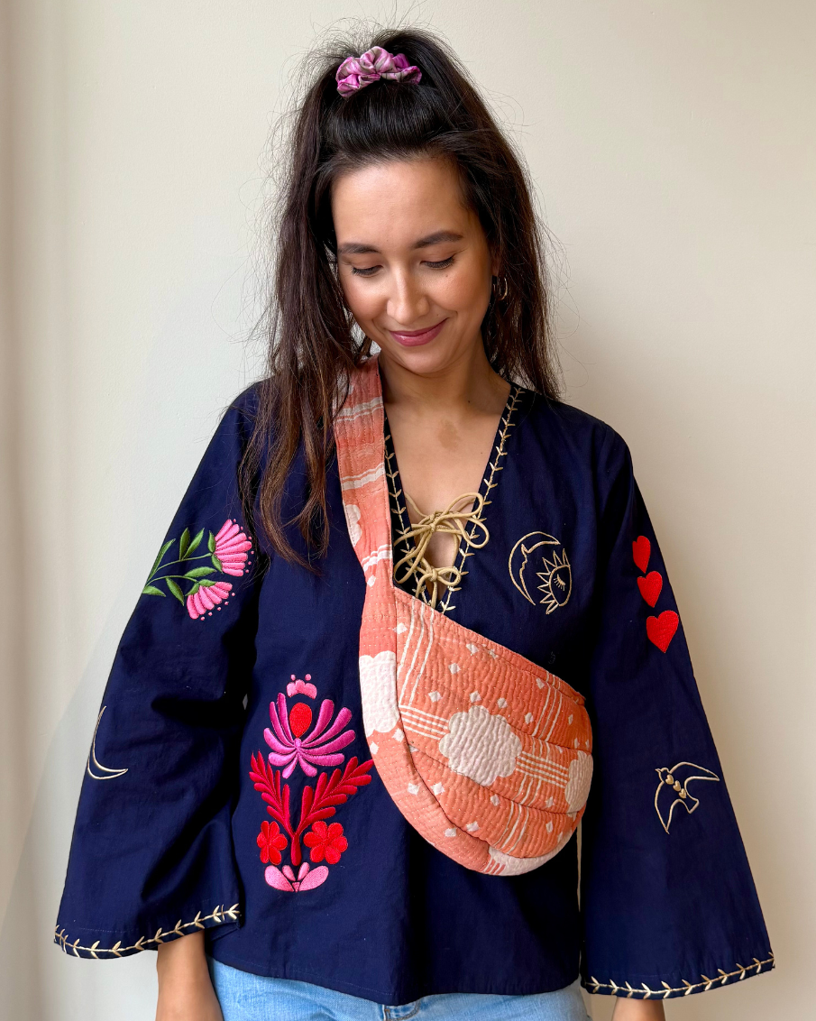 Deze kantha cross body tas is met veel liefde handgemaakt in India. Kantha stoffen bestaan uit verschillende lagen stof die op elkaar zijn vast gemaakt. Deze prachtige tas is gemaakt van vintage kantha stof. Op deze manier worden de stoffen hergebruikt en krijgen ze een heel nieuw leven (helemaal duurzaam dus)! Het kan dus zijn dat er wat versleten plekjes zichtbaar zijn. Dit hoort bij de tas en daaronder zit een nieuwe laag stof.