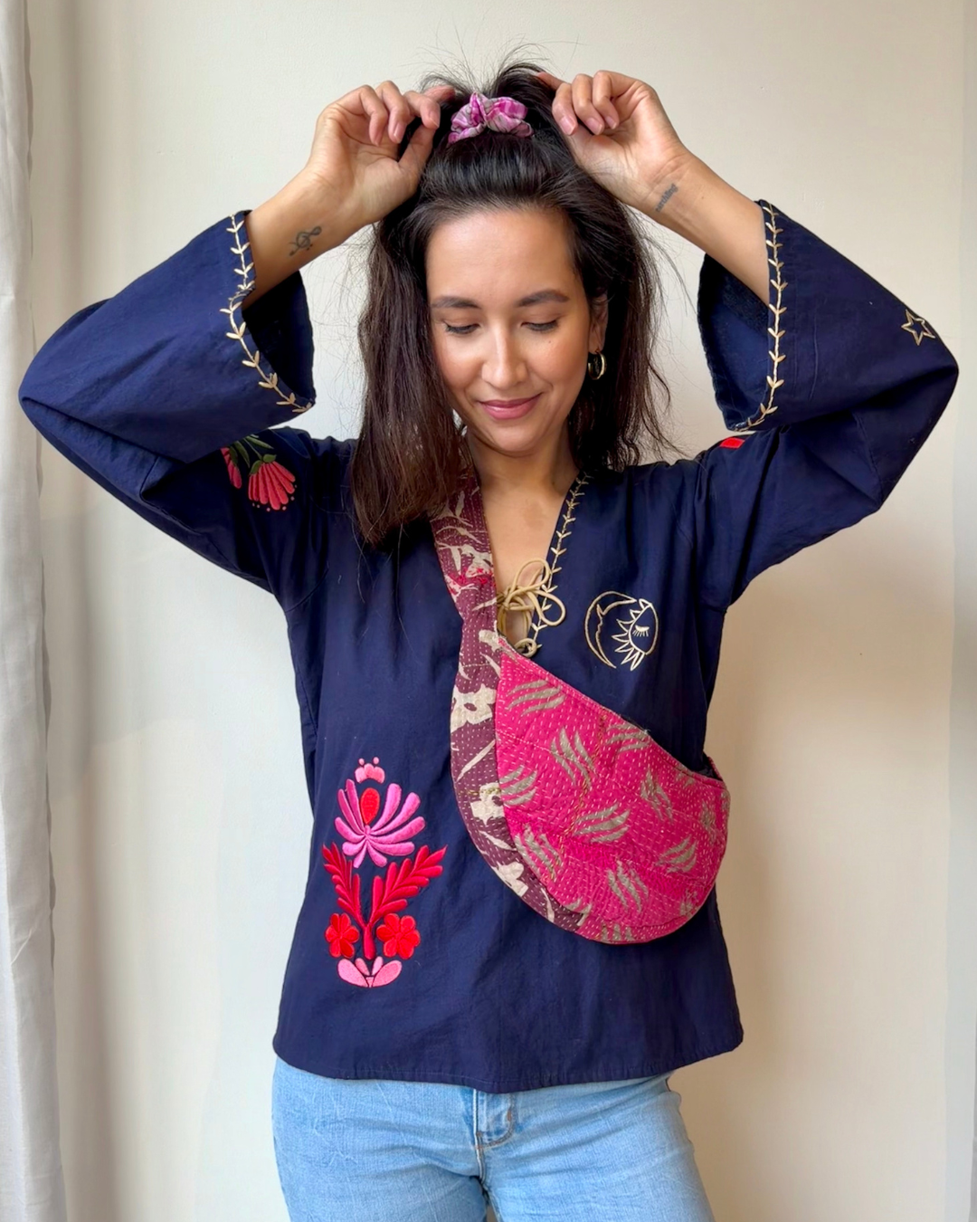 Deze kantha cross body tas is met veel liefde handgemaakt in India. Kantha stoffen bestaan uit verschillende lagen stof die op elkaar zijn vast gemaakt. Deze prachtige tas is gemaakt van vintage kantha stof. Op deze manier worden de stoffen hergebruikt en krijgen ze een heel nieuw leven (helemaal duurzaam dus)! Het kan dus zijn dat er wat versleten plekjes zichtbaar zijn. Dit hoort bij de tas en daaronder zit een nieuwe laag stof.