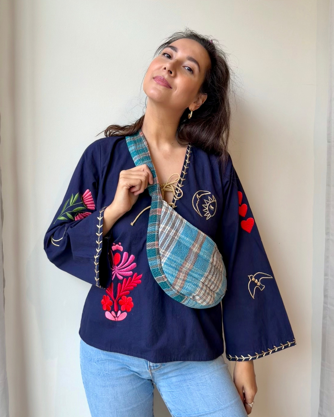 Deze kantha cross body tas is met veel liefde handgemaakt in India. Kantha stoffen bestaan uit verschillende lagen stof die op elkaar zijn vast gemaakt. Deze prachtige tas is gemaakt van vintage kantha stof. Op deze manier worden de stoffen hergebruikt en krijgen ze een heel nieuw leven (helemaal duurzaam dus)! Het kan dus zijn dat er wat versleten plekjes zichtbaar zijn. Dit hoort bij de tas en daaronder zit een nieuwe laag stof.