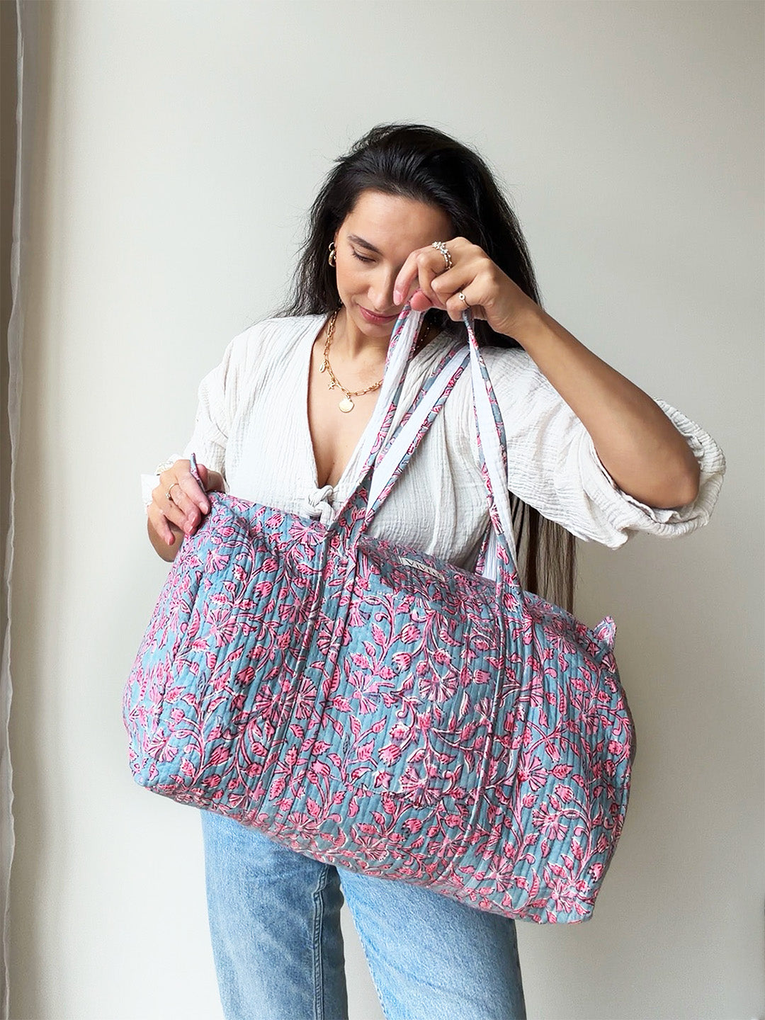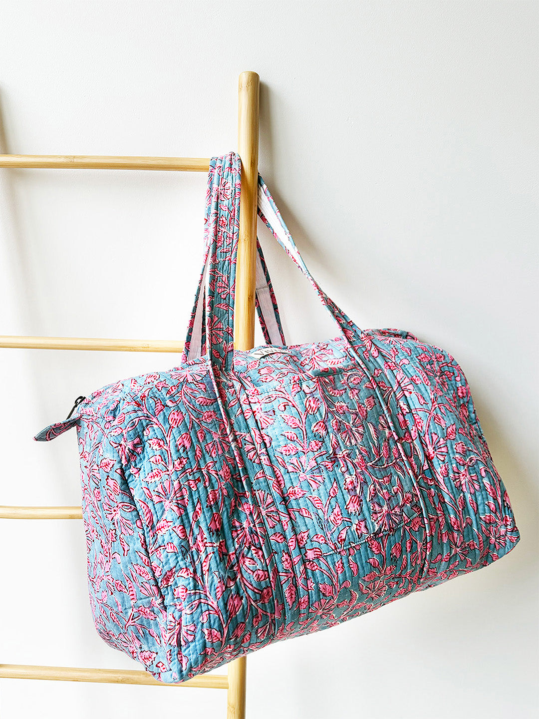 Beide items zijn met de hand gemaakt in India van katoen en combineren functionaliteit met een vrolijke, tijdloze uitstraling. De toilettas houdt je essentials overzichtelijk bij elkaar, terwijl de duffelbag ruimte biedt voor alles wat je onderweg nodig hebt.
