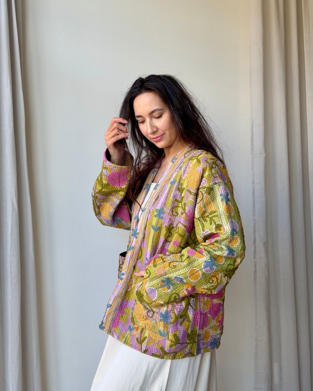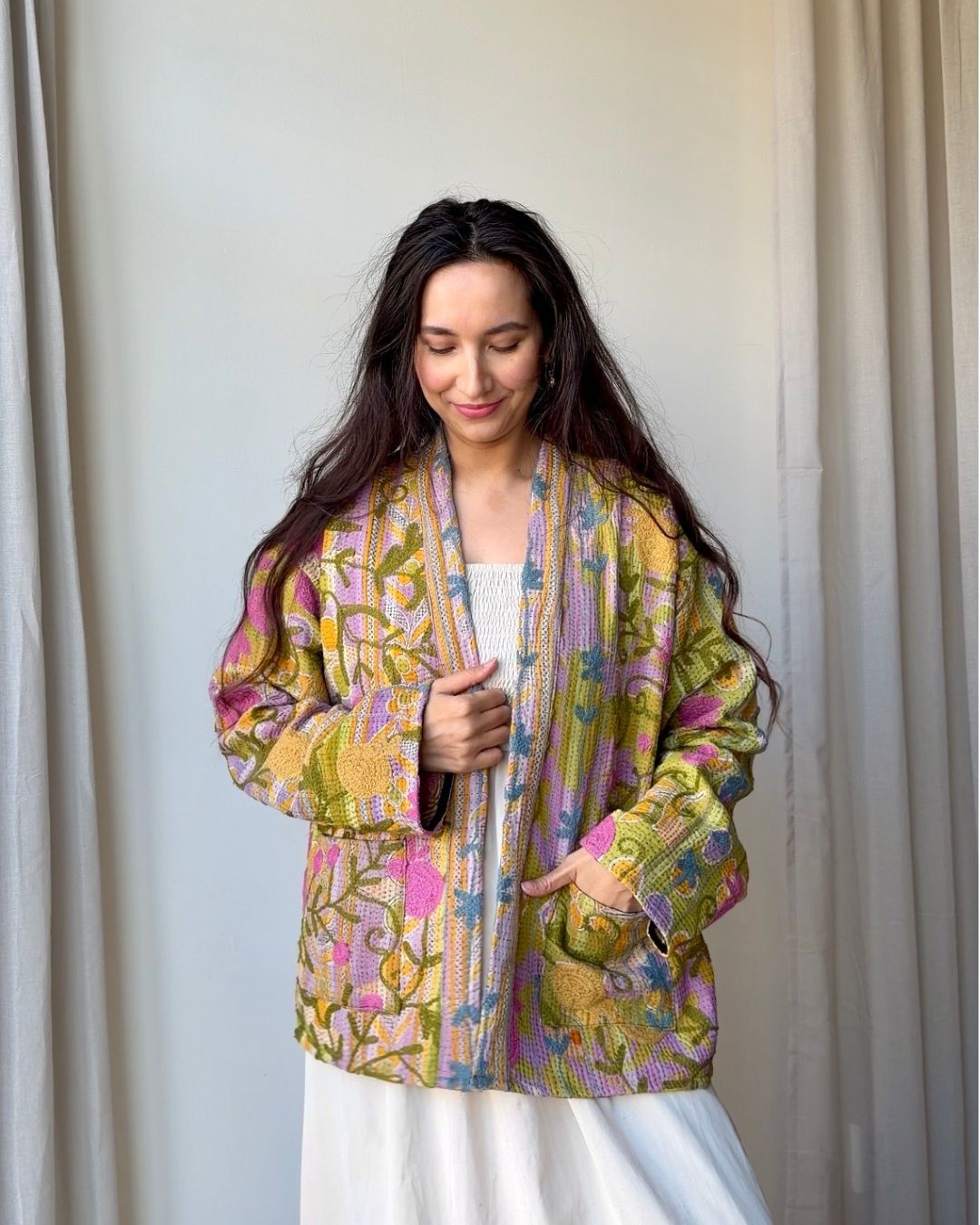 Dit prachtige jasje is handgemaakt in India van vintage kantha stoffen. Deze zijn handgeborduurd met prachtige patronen. Elke jas is helemaal uniek! Er is er dus maar een van elk. Doordat er gebruik wordt gemaakt van vintage stoffen kan het zijn dat er wat open plekjes op de stof zitten. Maar doordat kantha stof bestaat uit meerdere op elkaar gemaakte laagjes stof bestaat zit er gewoon en nieuw laagje stof onder!