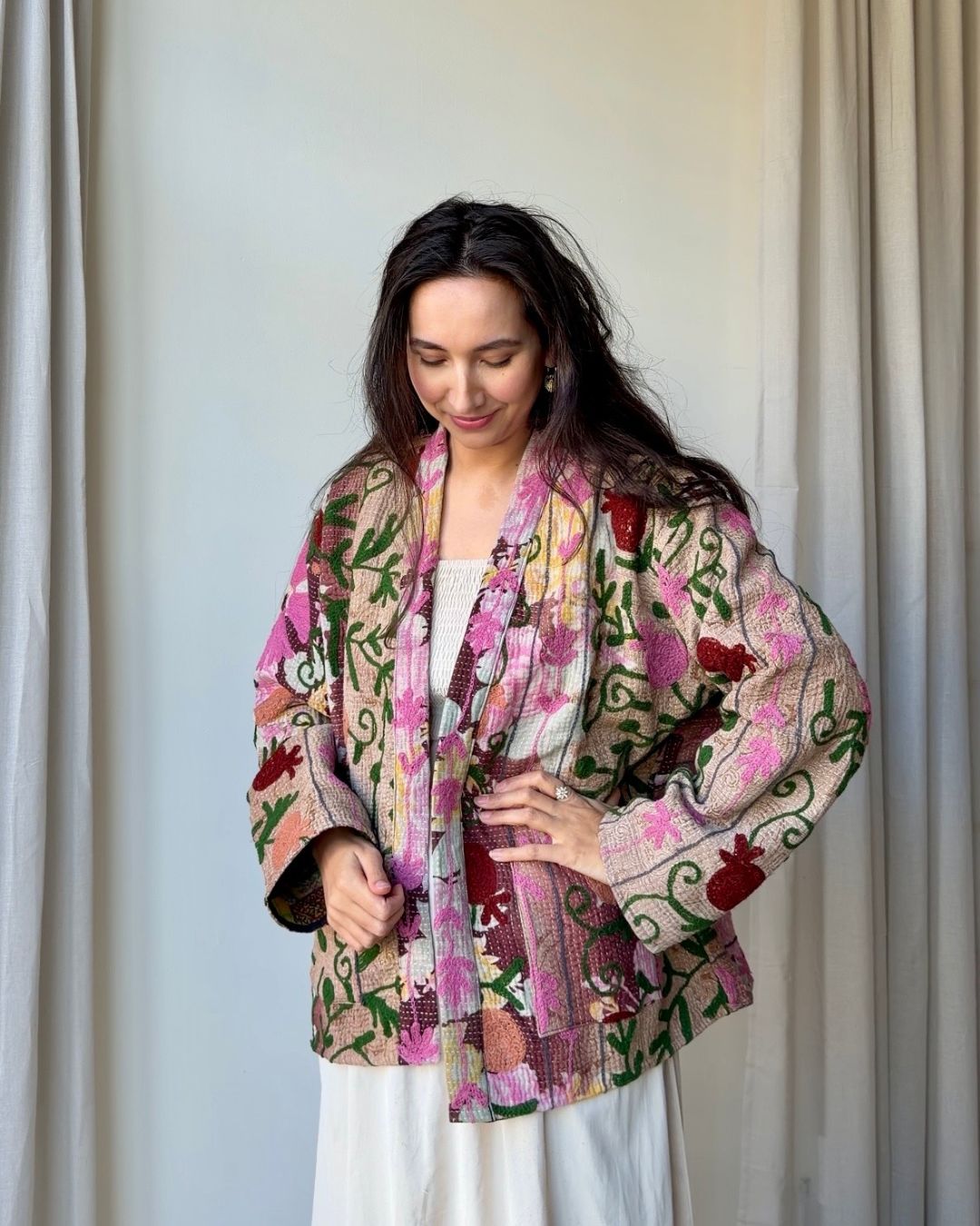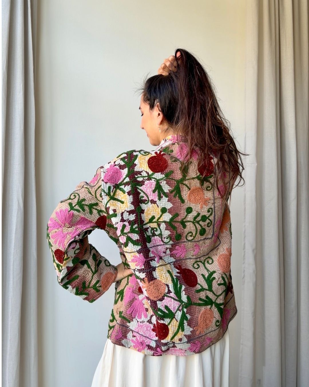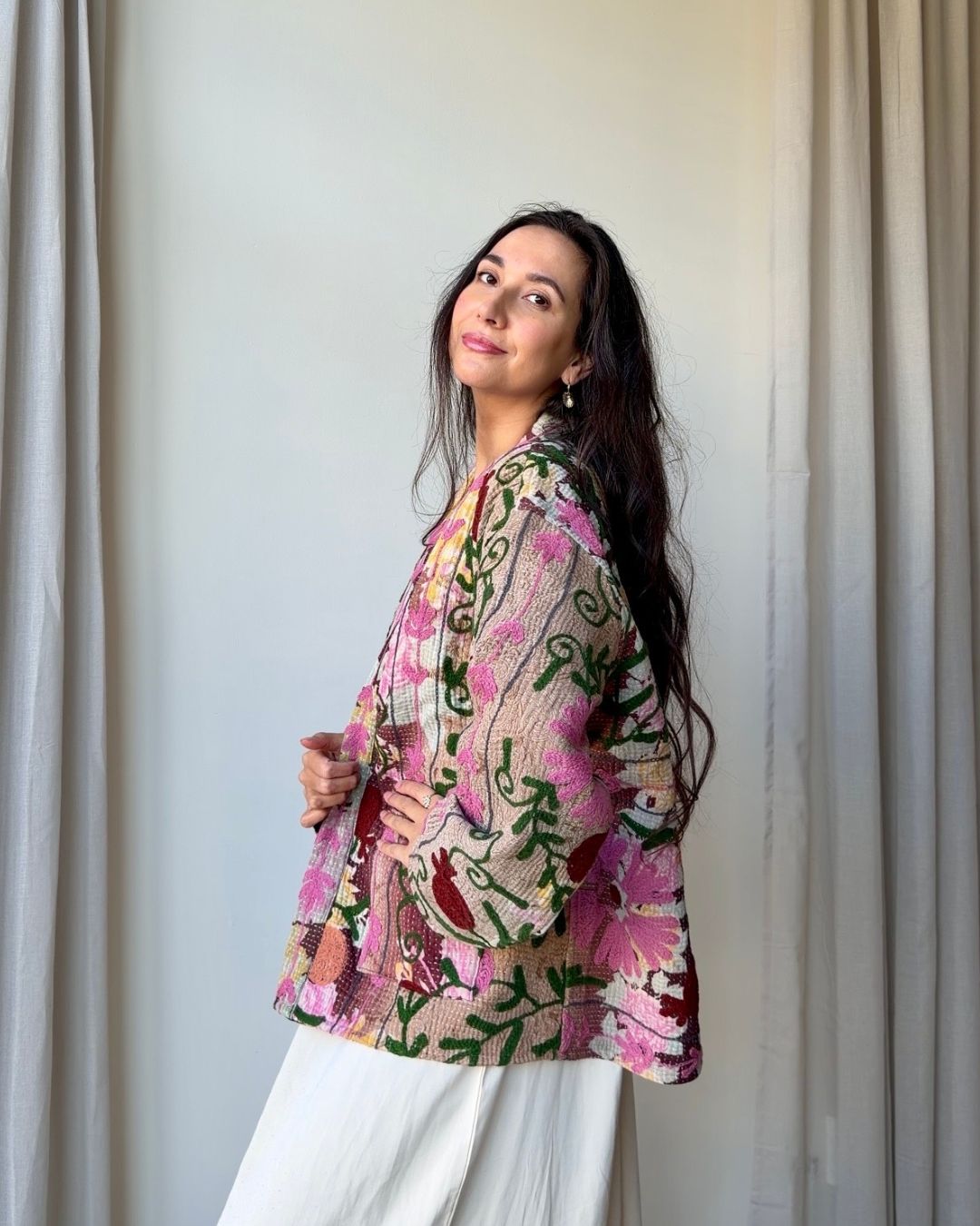 Dit prachtige jasje is handgemaakt in India van vintage kantha stoffen. Deze zijn handgeborduurd met prachtige patronen. Elke jas is helemaal uniek! Er is er dus maar een van elk. Doordat er gebruik wordt gemaakt van vintage stoffen kan het zijn dat er wat open plekjes op de stof zitten. Maar doordat kantha stof bestaat uit meerdere op elkaar gemaakte laagjes stof bestaat zit er gewoon en nieuw laagje stof onder!