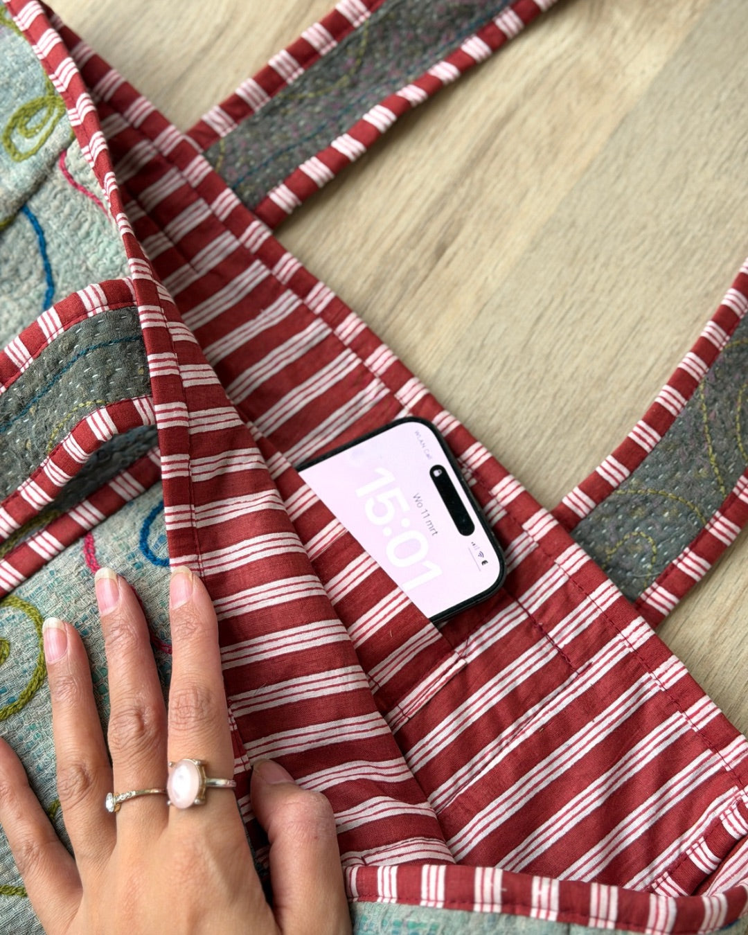 The bag is handmade with a lot of love in India. This beautiful bag is made of vintage kantha fabric. In this way, the fabrics are reused and given a whole new life (completely sustainable)! It may therefore be that some (worn) spots are visible.