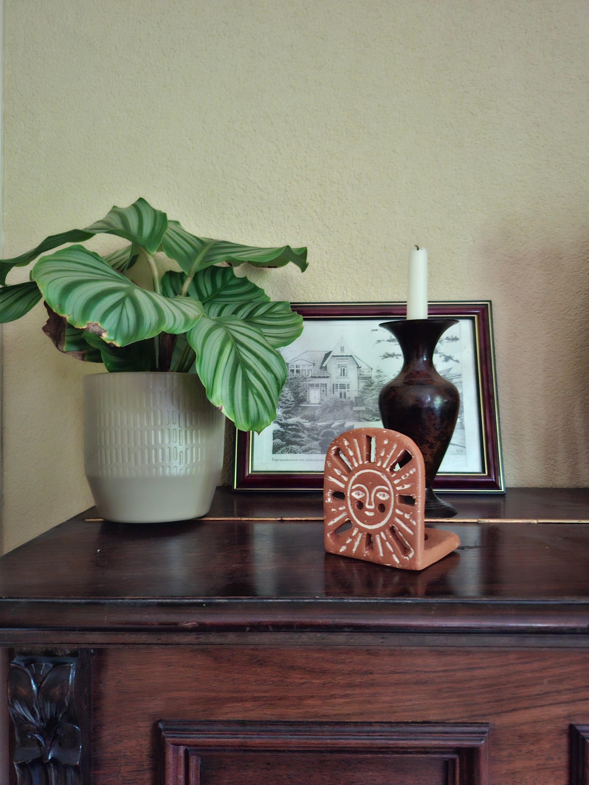 Creëer een warme en sfeervolle sfeer in je woonkamer met deze prachtige terracotta theelicht kaarshouder. Aan de achterkant siert een zon, terwijl de kleine gaatjes in de houder een betoverend silhouet creëren wanneer het kaarslicht door de houder schijnt. Perfect om je interieur een gezellige een rustgevende touch te geven.