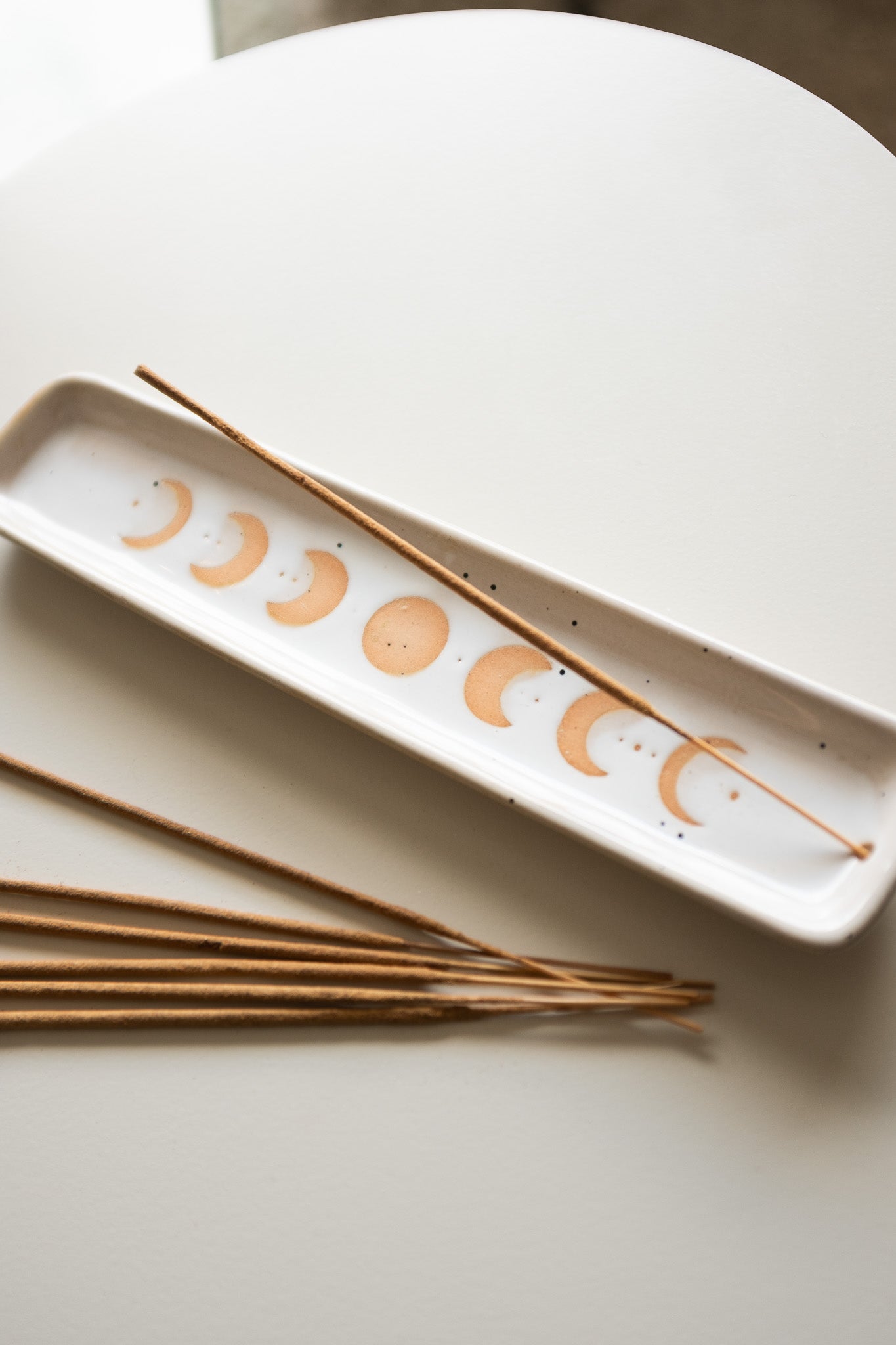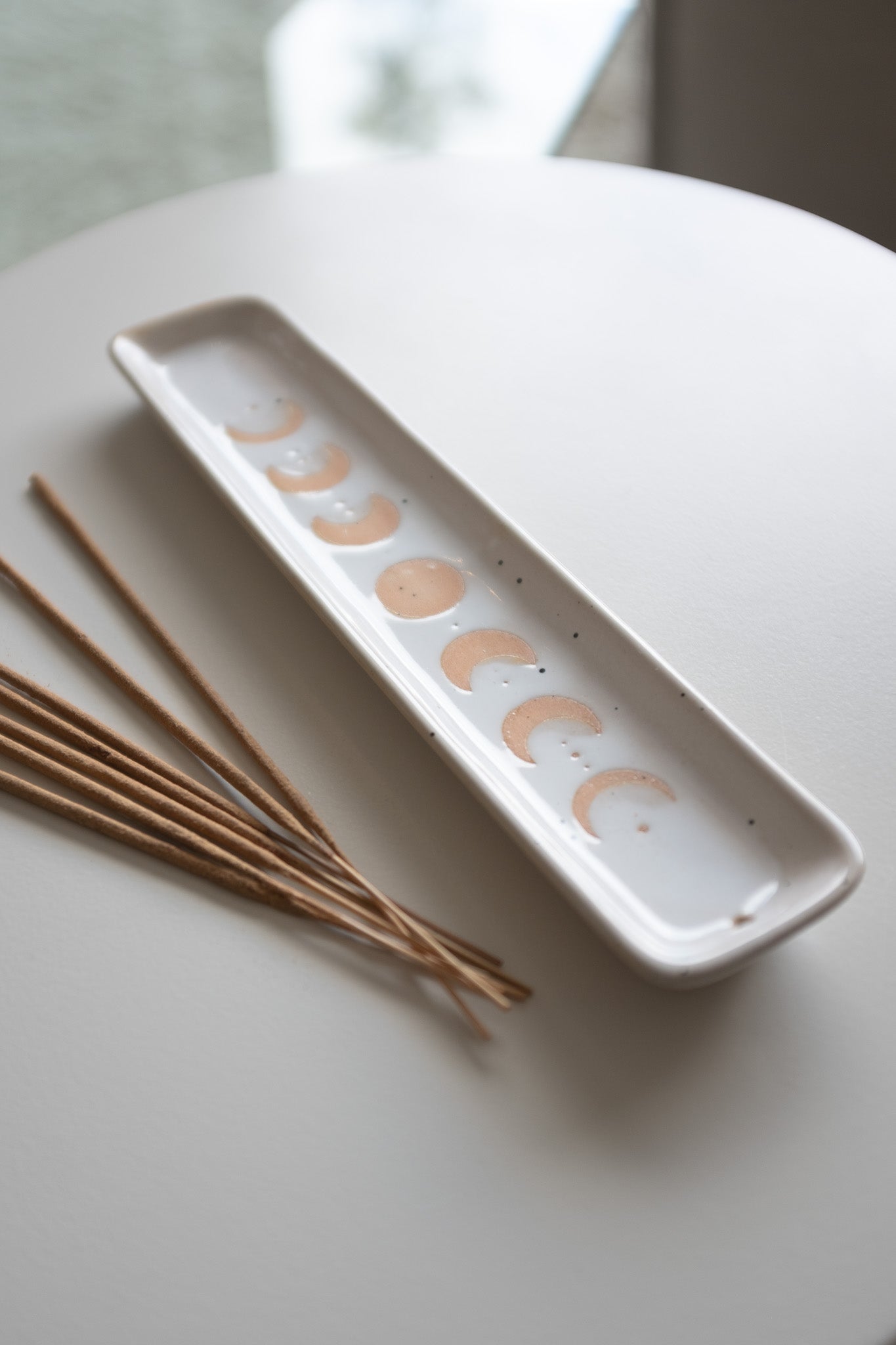 Deze prachtige wierookhouder met maanontwerp is geïnspireerd op de fases van de maan. De zachte kleuren en maanfasen brengen een rustige, dromerige sfeer in je interieur. Het keramische schaaltje is perfect om wierookstokjes in te branden, maar ook handig voor het bewaren van kleine items zoals sieraden of kristallen. Een multifunctioneel object vol symboliek én stijl!